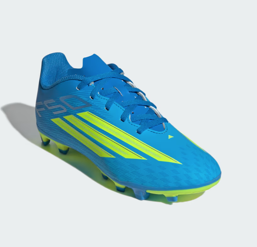 F50 Club Firm Ground / Multi Ground Football Boots Kids are crafted to offer speed and precision. Designed for firm and multi-ground surfaces, the FXG outsole gives optimal traction, providing stability and agility across natural and artificial grass.The textured synthetic upper offers a soft, comfortable fit, whilst the lightweight synthetic tongue with punch holes enhances airflow. Finished with a lace closure for a secure fit and the F50 logo on the rear side of the shoe, these adidas boots offer both style and performance for budding footballers.